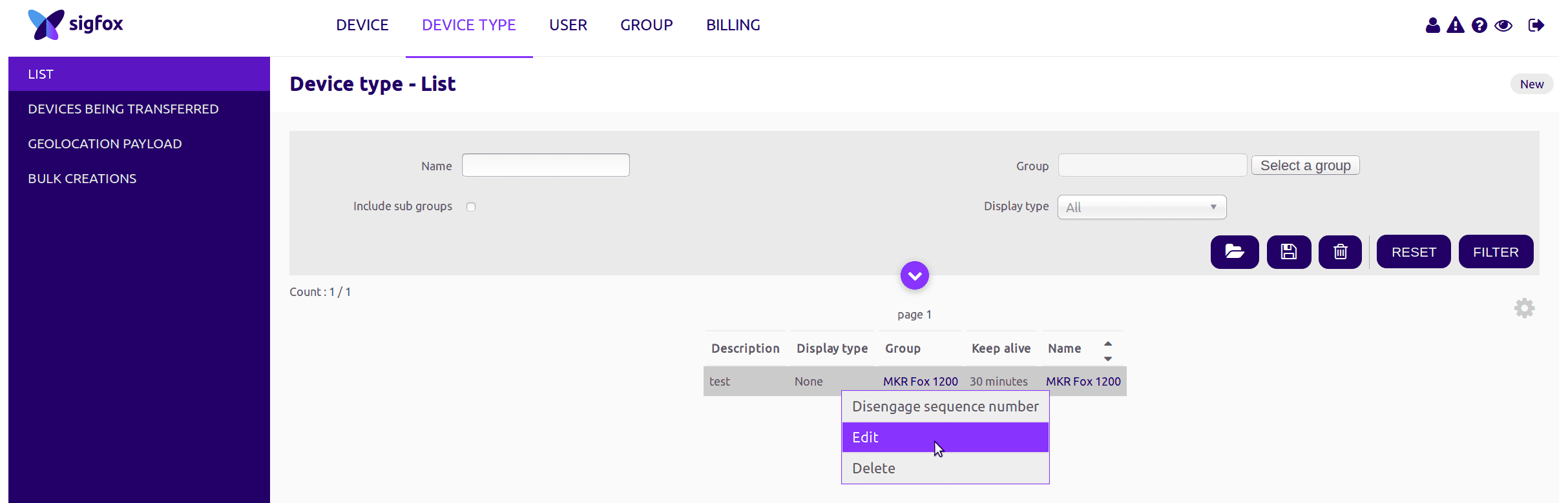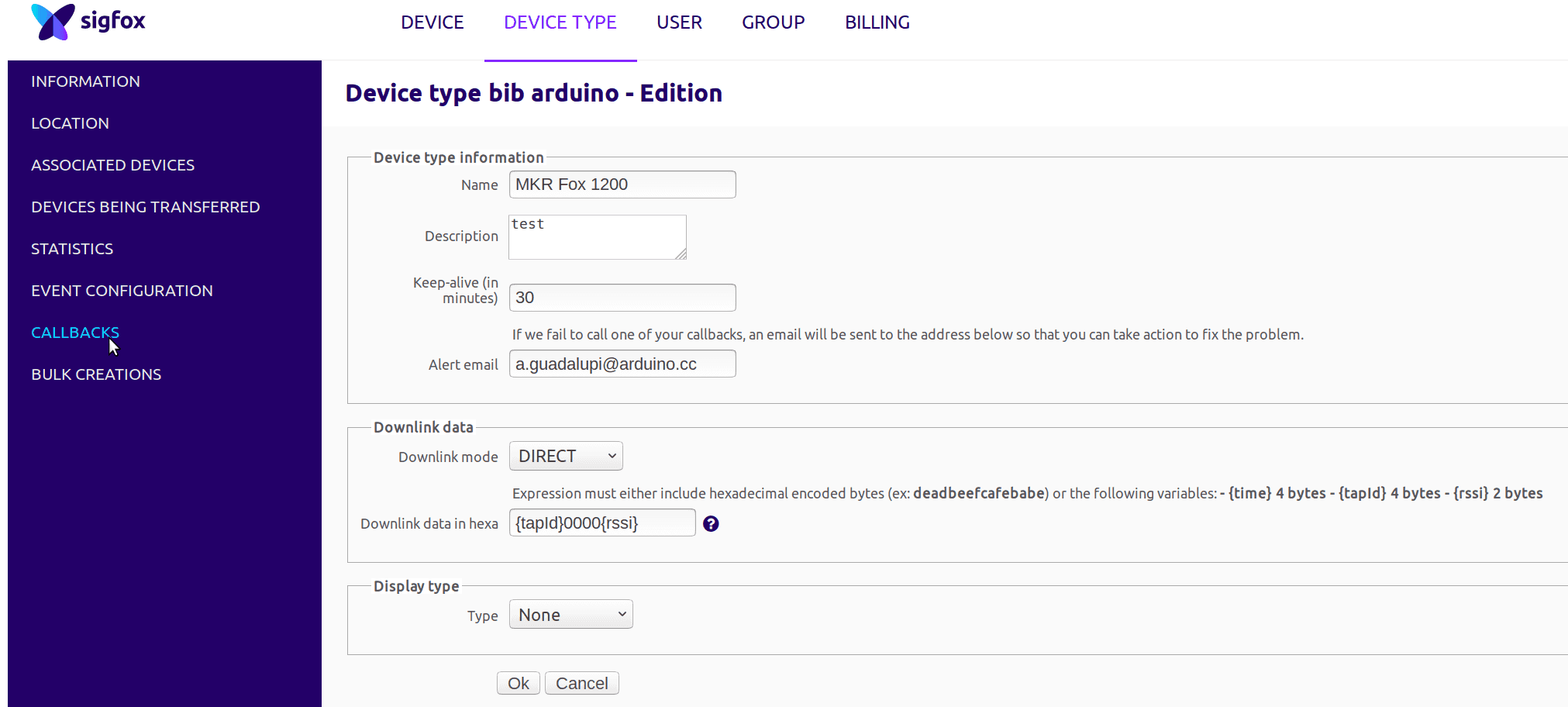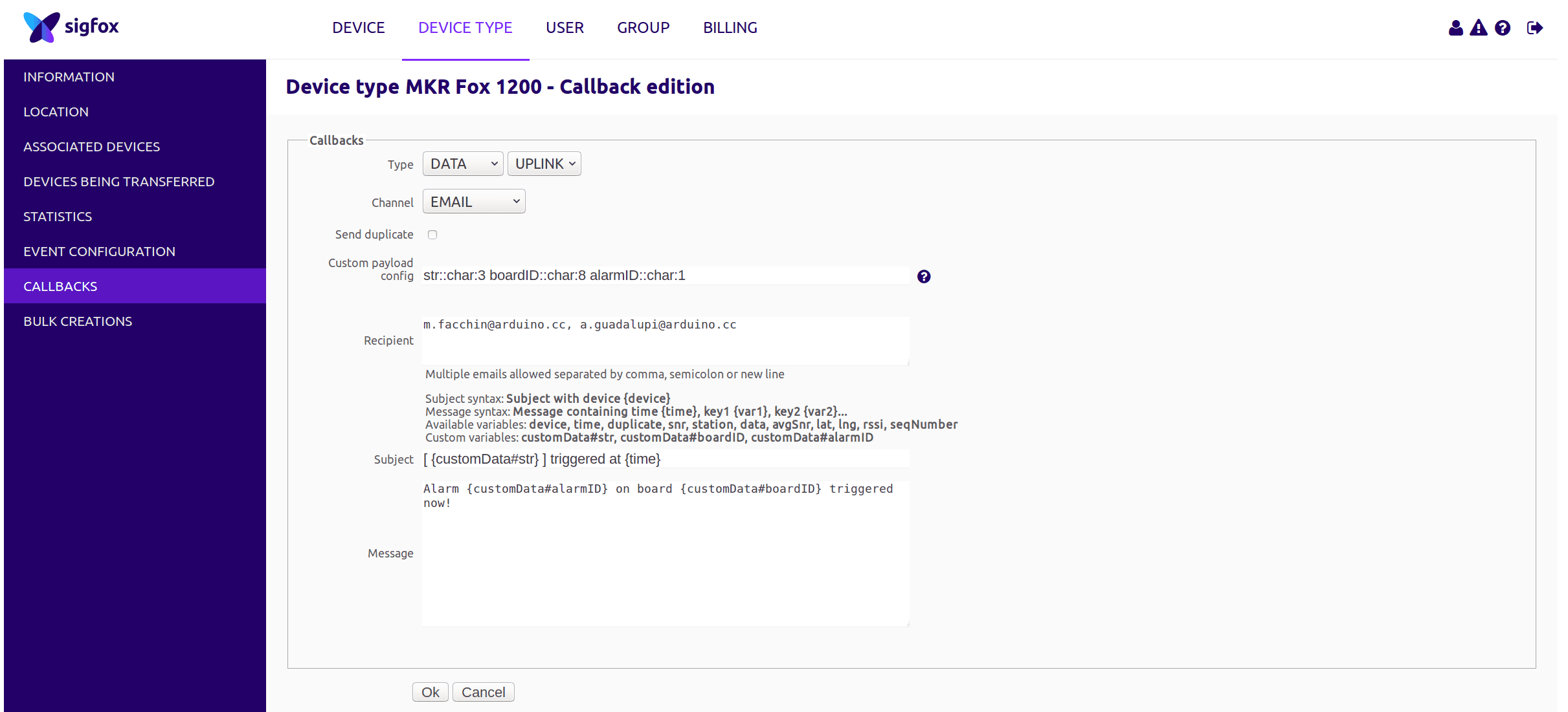To configure the backend to send an email you have to access your control panel, click on Device Type, select MKR Fox 1200 from the list and click edit.