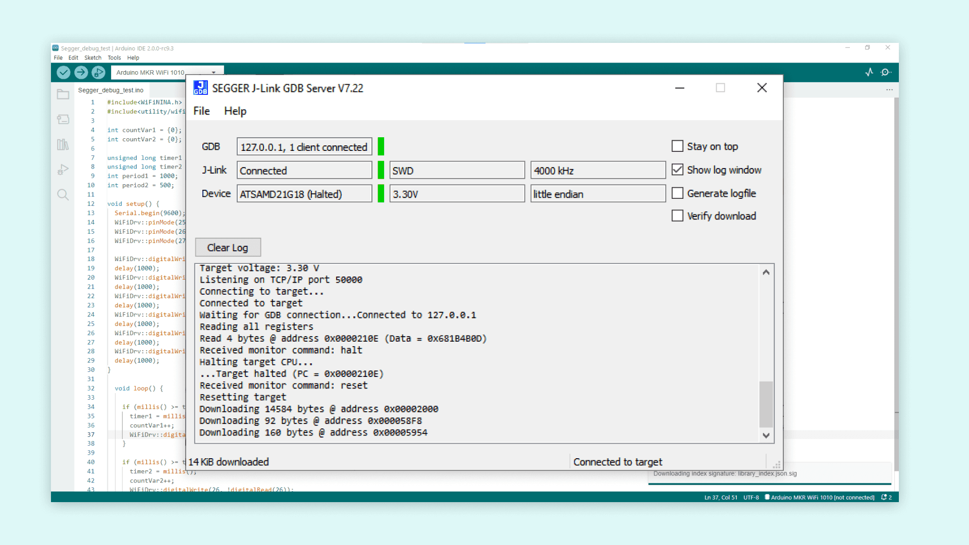 This tutorial will show you how to debug an Arduino sketch using an Arduino MKR board and the Segger J-Link probe. It will go through how to connect these and use the Arduino IDE 2 to then debug a sketch.